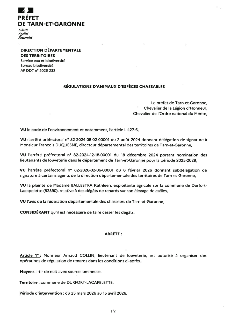 Arrêté de régulation de renards